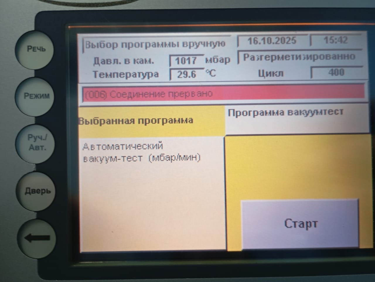 Коллеги, помогите разобраться с неисправностью: После запуска программы проходит герметизация рабочей камеры, далее ничего не происходит и через 15-30 секунд камера разгерметизируется и выводится сообщение об ошибке "(006) Соединение прервано"