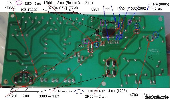Здравствуйте. Ремонтировал пока 2-а Дезара на ICB1LF02G. В одном была неисправна только МС, в другом: - МС; полевик; 2 диода US1M (поставил S1M); 22 Ома; 2 Ома — 2 шт.; входные предохранители. Отличие Дезара-3 от 5-го: в 3-м - 2 шт. резисторов по 1 Ом, в 5-м — 3 шт., в 3-м - полевик T5N50, в 5-м - T8N50. Аналог T8N50 — IRF840. Прикладываю фото платы со стрелками, овалами для пользования. К сожалению своему, какие диоды и конденсаторы я не знаю. Если кто сможет дополнить, я доработаю фото. Не знаю, с какой целью все резисторы применены с точностью 1%.