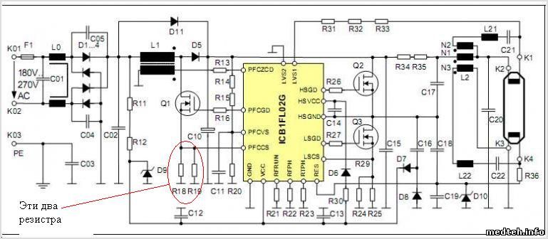 По поводу неисправности плат на ICB1FL02G "не включается или включается на секунду" , чаще всего это неисправность первички трансформатора на 12 вольт (питание вентиляторов и блока индикации наработки). Методика проверки - выпаивание этого трансформатора. Лампы зажигаются. Ремонт - замена платы или перемотка первички трансформатора или установка дополнительного блока питания на 12 вольт.