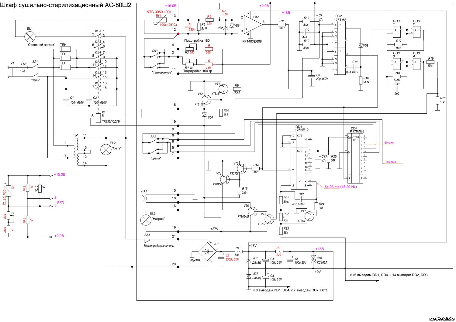 Здравствуйте, у меня возникла проблема после замены термо датчика, шкаф перестал набирать нужную температуру. При установке режима 180 градусов набирает около 100. Датчик проверял на 180 градусах 3,3к. Шкаф пришел без схемы, еще и с переделками. Товарищи, есть ли у кого нибудь схема этого агрегата, помогите пожалуйста.