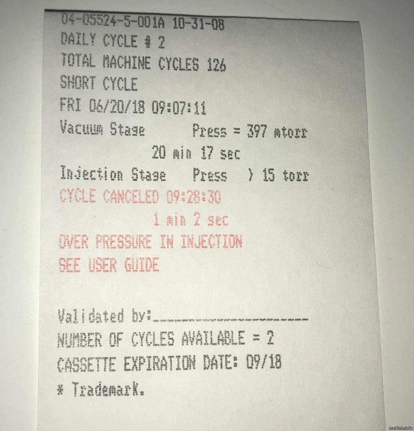 Если не продырявить касету цикл не пойдет, выдаст ошибку. Могут быть сломаны иглы в клапане, их дам две. Иглы могут бить мимо, в корпус, тогда на касете остаются следы удара, от чего они и ломаются. Случается что на касете штрих код бракованный, поэтому не видит, но это не единственная причина.