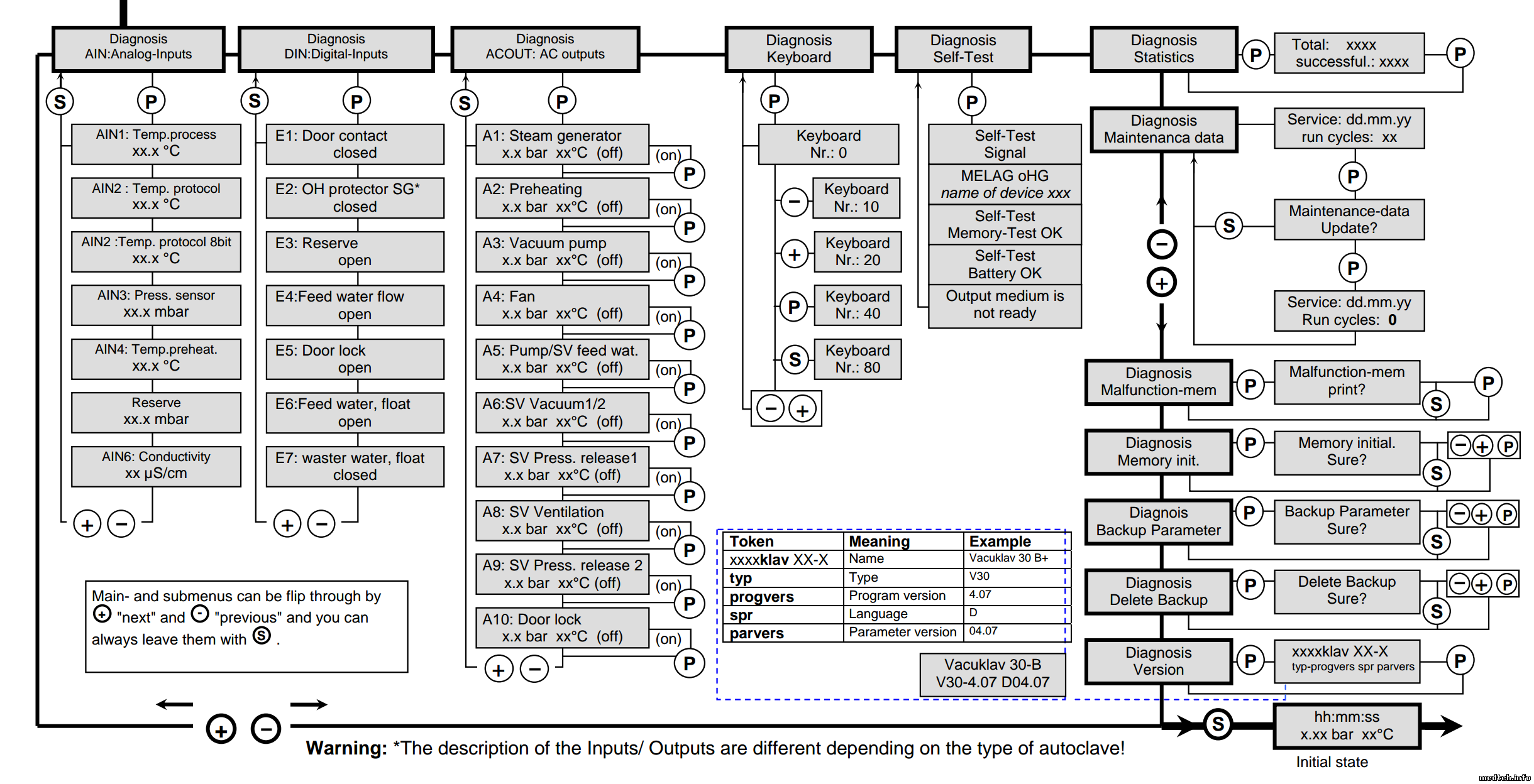 1. В диагностическом меню есть пункт - Keyboard: Nr: 0 - кнопка не нажата Nr: 10 - нажата кнопка - Nr: 20 - нажата кнопка + Nr: 40 - нажата кнопка P Nr: 80 - нажата кнопка S 2. Если отключить панель управления/экран от основной платы и включить аппарат, то должен, на основной плате, включиться светодиод 2 означающий включение преднагрева (при условии вкл. по умолчанию). Или должен быть звуковой сигнал от срабатывания поплавков отсутствия или переполнения дист. воды.