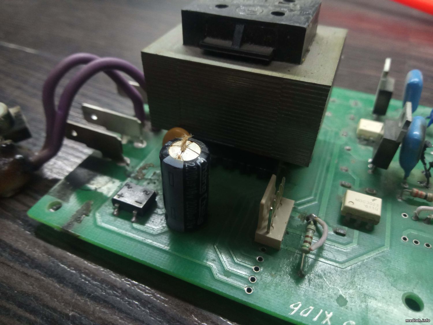 Что показало вскрытие: датчик температуры исправен. Ошибка Err2 исчезла, но теперь при включении показывает 0.0. Запускается, нагрев идет, но температуру не отображает ... Похоже процессор "накрылся" ... Ещё на плате виден взорвавшийся конденсатор ...