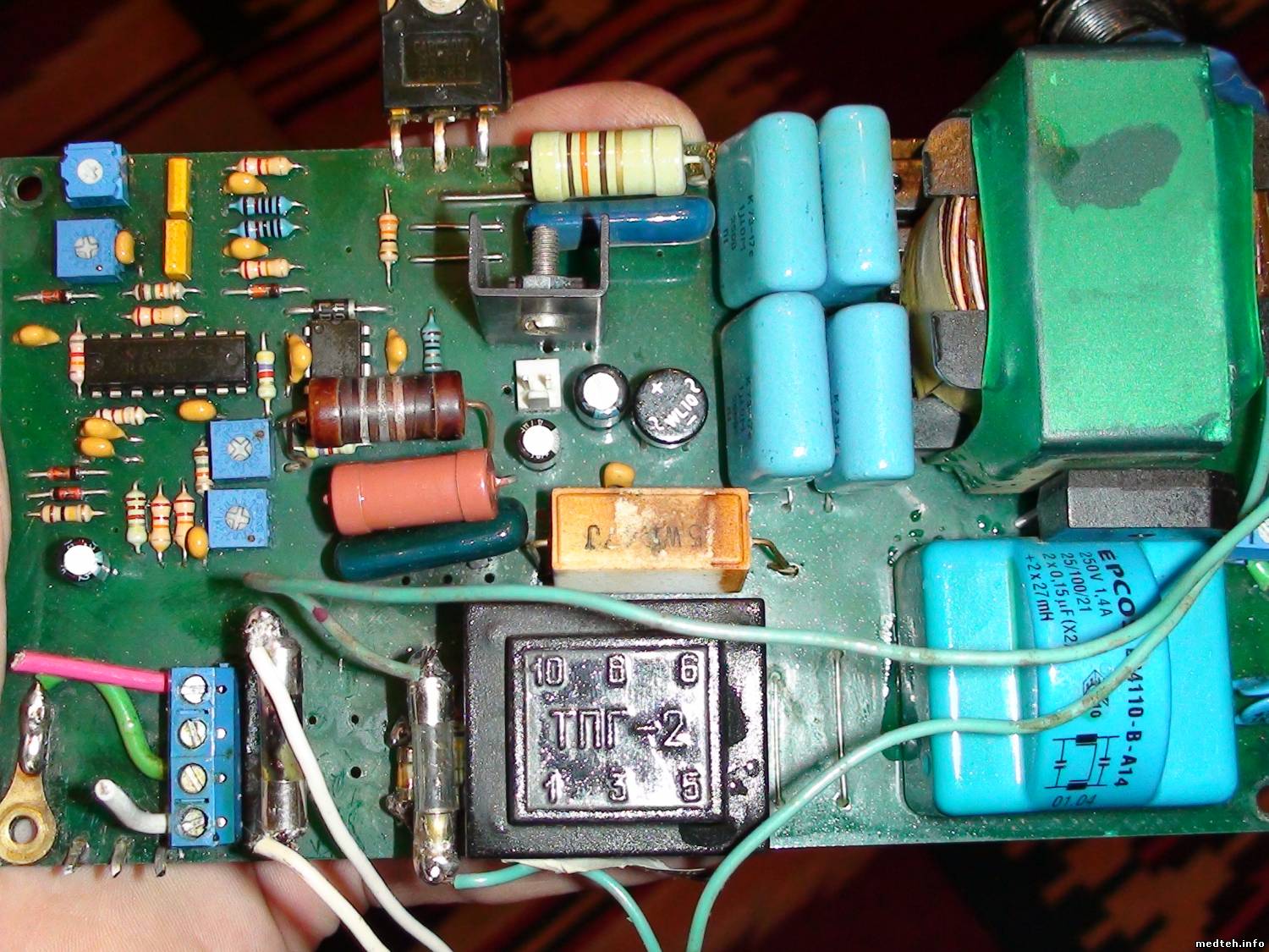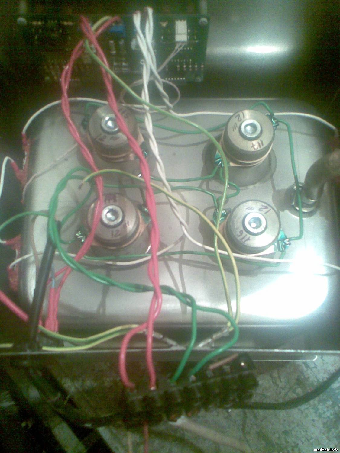 Ультразвуковая ванна (мойка) 12ТТЦ - всё горит и работает, даже табло считает, а вот ультразвук не пашет. Вскрыл - сгорел предохранитель на второй плате питания преобразователя. Сестрички сказали, что перед этим были сбои по звуку. Видимого короткого нет, ставлю предохранитель - горит