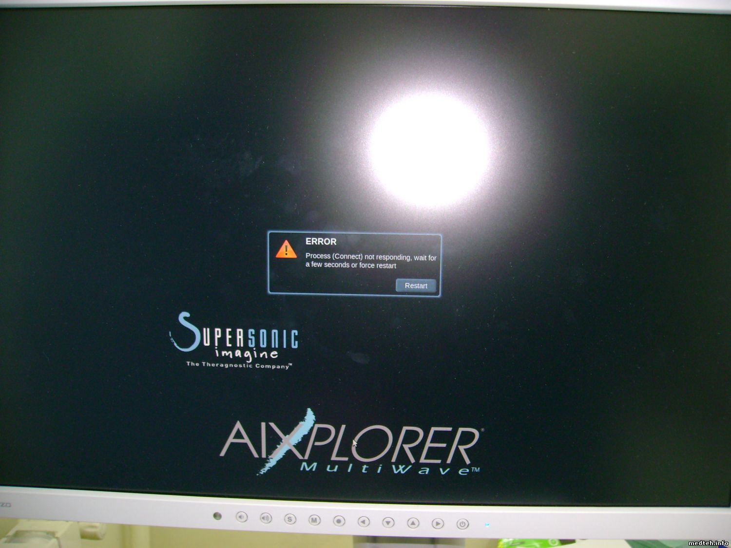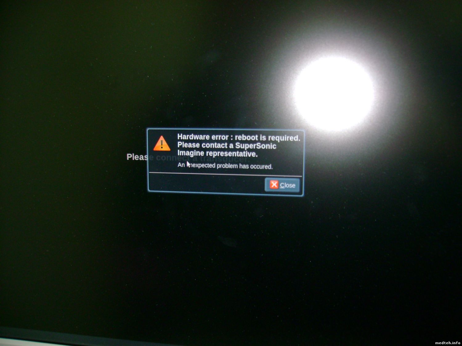 Здравствуйте. Есть аппарат Aixplorer от SuperSonic Imagine изначально не загружался и выдавал ошибку(фото 1),на данный момент он включается и загружается и выдаёт ошибку(фото 2), что не исправно оборудование и требует обратиться в сервис. Ошибку закрываю(фото 3), аппарат полностью управляется, но датчика он не видит. Подскажите в коком направлении копать?