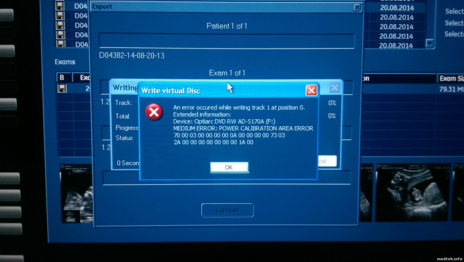 День добрый. Есть аппарат Voluson E8, на нем стал выделыватсья привод(ошибка на скрине). Захотел поменять, купил другой IDE привод, поставил. При попытке записи обследования пишет Insert disk. Беда. Если попробовать записать из под Windows, пишет прекрасно. Накатывал заново софт с новым приводом - не помогло. Может я что-то не так делаю?