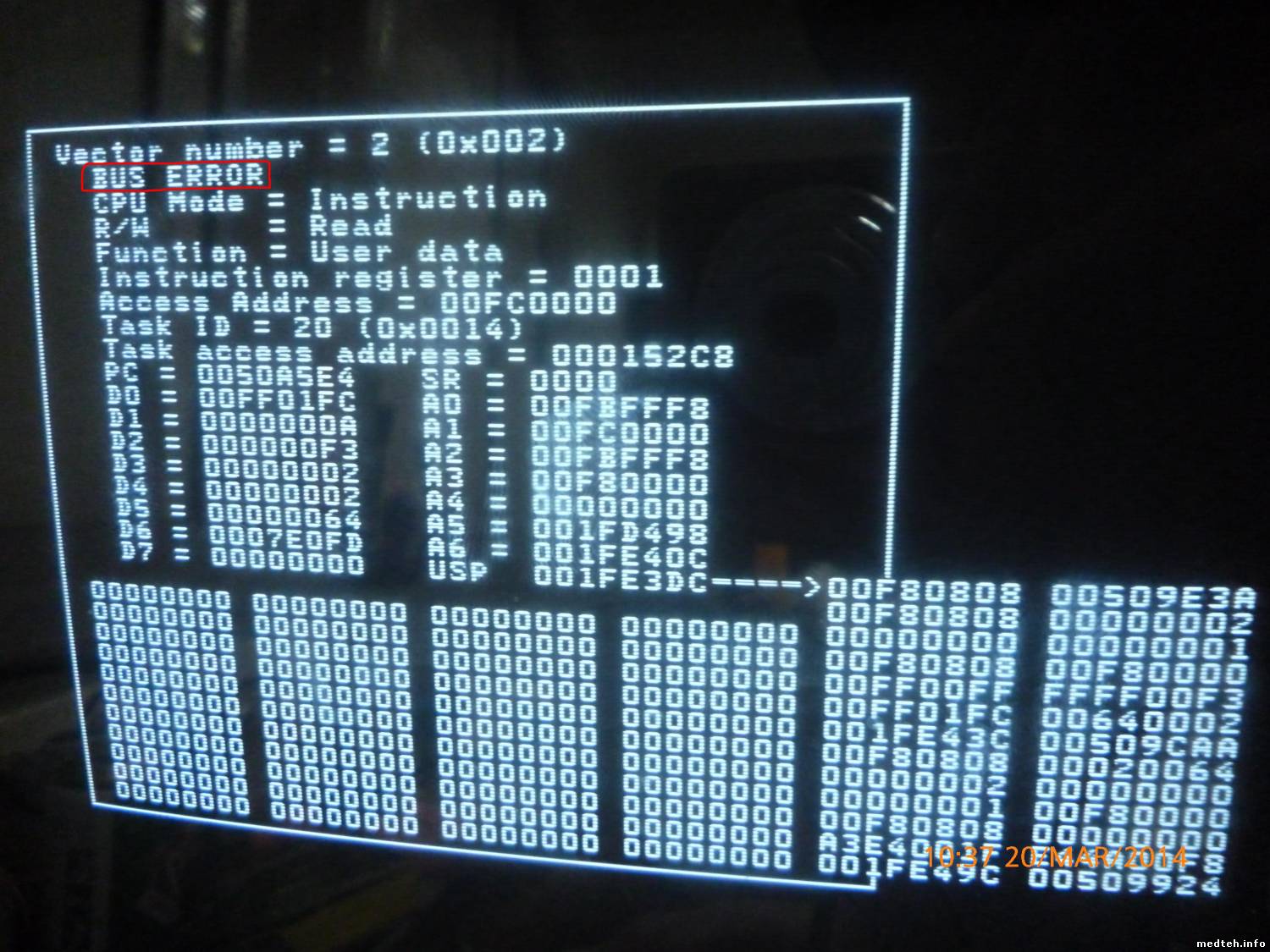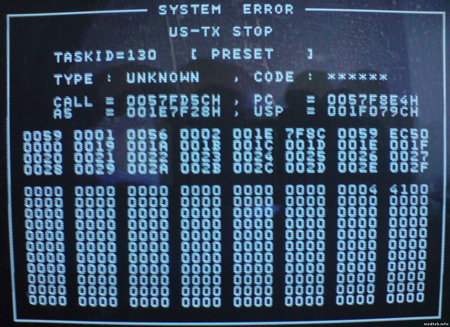 Приветствую, коллеги! Бьюсь с УЗИ ALOKA SSB-1000 Вот как выглядит экран: SYSTEM ERROR USTX STOP TASKID»130 [ PRESET ] PC 5828E4H A5 1E7F28H USP 1F079CH CALL 582D5CH