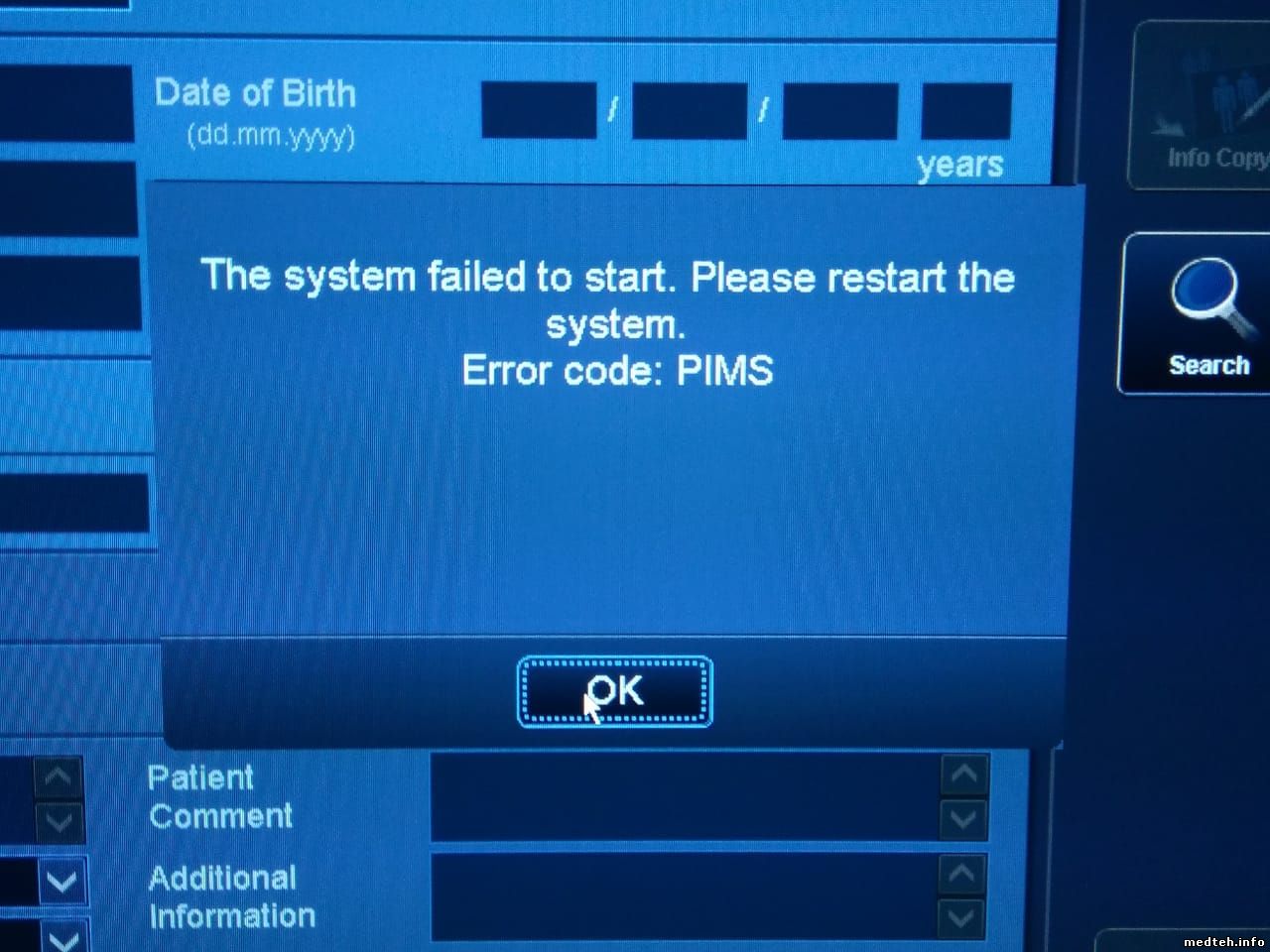 Проблема такая, аппарат включается и запускается, врачи говорят, что стал долго запускаться, после загрузки ПО появляется сообщение: ошибка запуска, произведите перезагрузку. Ошибка: Pims, ExamReview, IOV.