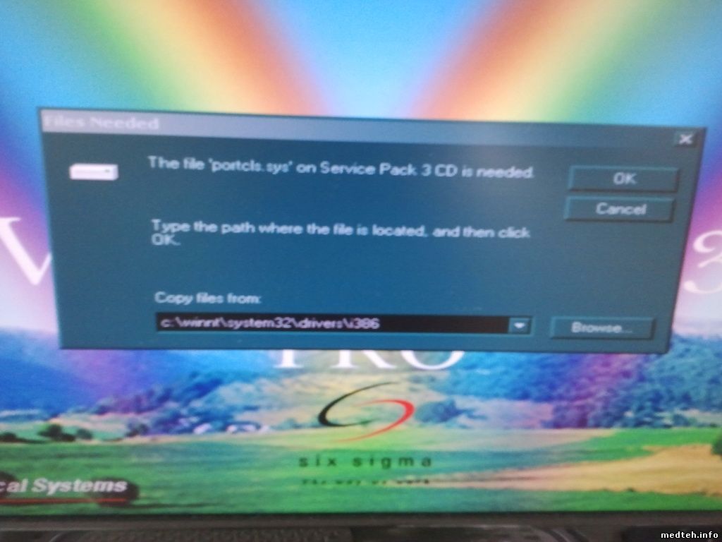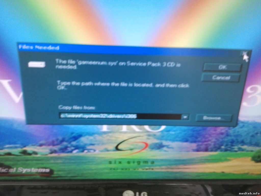 Добрый день. Просьба оказать помощь в решении проблемы. При загрузке аппарата выходит ошибка: Program Error: DolphShell.exe has generated errors and will be closed by Windows. You wiil need to restart the program. An error is being created. Я наживаю Cancel. Дальше высвечивается окно File Needed : The file 'msmpu401.sys' on Windows 2000 Professional CD is needed. Type the path where the file is located, and then click OK. Copy files from: c:\winnt\system32\drivers\i386. Но при открытия по этому пути, папка пустая и там нет этого файла. При закрытия этого окна, ни чего не происходит на экране остается заставка.