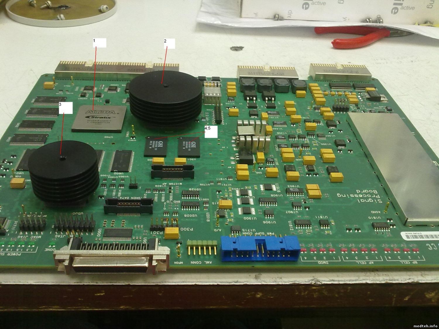 Был проверен весь БП, который оказался исправным, далее феном прогрел проц (1) и горячую плату установил на место- аппарат запустился без проблем. Положил плату в холодильник - неисправность возникла снова. В общем, поместил всю плату в ИК паяльную станцию и аккуратно прогрел все микросхемы, обозначенные на рисунке. до расплавления шариков. В результате всех этих манипуляций, аппарат починился и появились все напряжения +/- HV. Вывод: за время эксплуатации,(почти 10 лет) в результате изменения температуры кой какие шарики могут отвалиться от мс/схем и аппарат буде выдавать подобное сообщение.Для полной уверенности лучше пропаять все мсх. указанные на фотке. Следите за температурой, чтоб не повело плату...