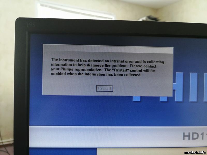 "Good afternoon. Ultrasound machine Philips HD 11 XE working with convex probe in power Doppler mode freezes and gives the display window: "The instrument has detected an internal error and is collecting information to help diagnose the problem / Please contact your Philips representative. The" Restart " control will be enabled when the information has been collected. " Please help with a solution to this problem."