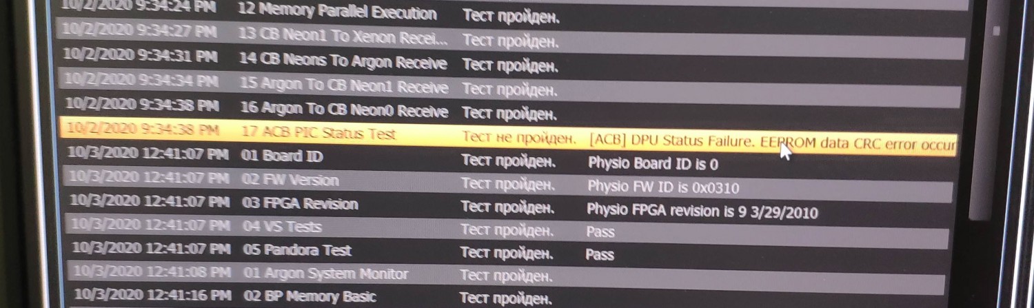 Сделал тесе в логах - получил две ошибки: - Name="13 CB Neon1 To Xenon Receive" Result="Failed" Description="[ACB / Channel Bd]: Channel Board Neon1 to ACB Xenon Receive failure. - Name="17 ACB PIC Status Test" Result="Failed" Description="[ACB] DPU Status Failure. EEPROM data CRC error occurred at last reset." Кто подскажет где на плате Channel Board находится Neon1, ближе к разъёму платы ACB или дальше. Думаю, что отстали шары на Neon1. Неисправность появилась после снятия платы. Вторая неисправность возможно связана с первой.