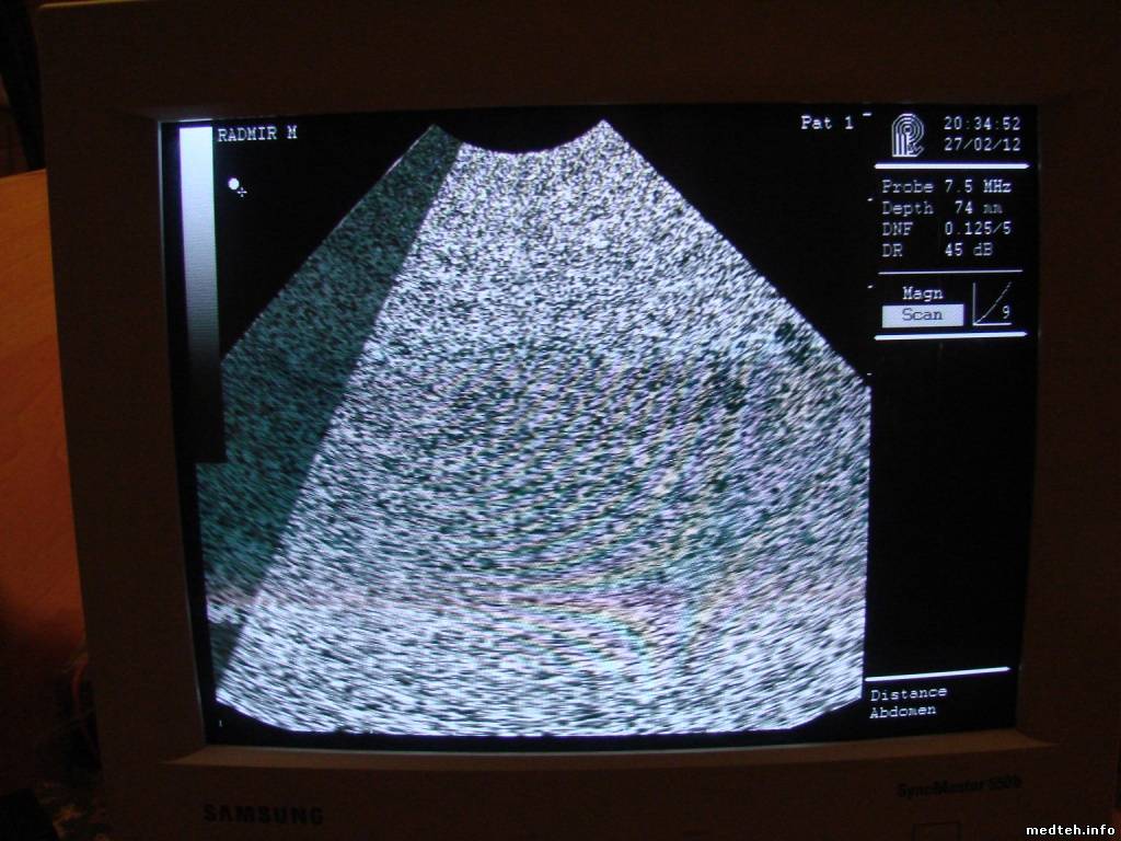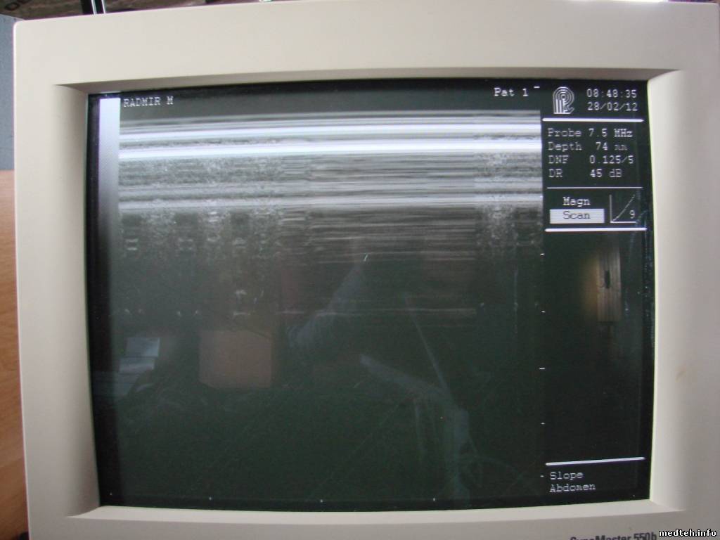 Пробовали-ли вы подключать другой датчик . Картинка очень похожа на то , что либо нет , либо не нормальная синхронизация с датчика . У меня было что-то похожее когда застывало масло, обрывалась катушка обратной связи в датчике или что-то случилось в блоке управления приводом датчика( там-же находиться и синхронизация). Датчик вообще сканирует? Не стучит? Выдерживает угол 90 градусов? А это имедж-изображение стоит мертво или двигается (дергается) с движением датчика? Без нормальной синхронизации не включается обработка сигнала и на экране мусор из памяти и не обновляется.