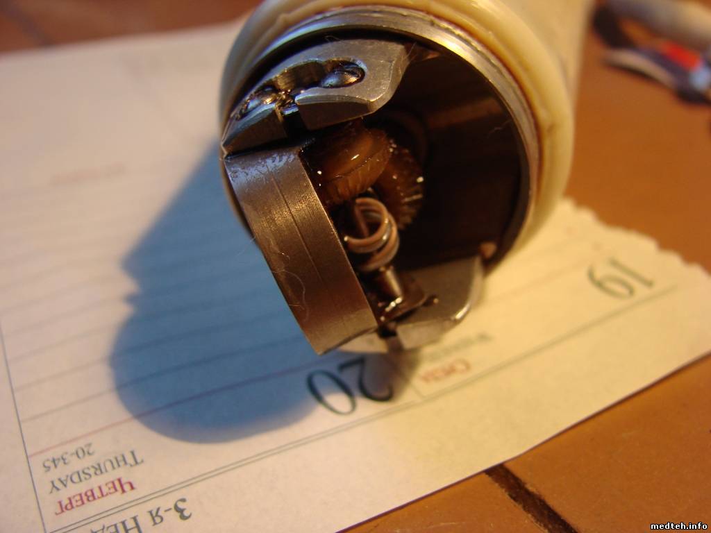 Вот что показало начало вскрытия. Это тот который заклинило (3,5МГц) в неестественной позе. При разумном приложении силы на место не встает. Вполне возможно, что