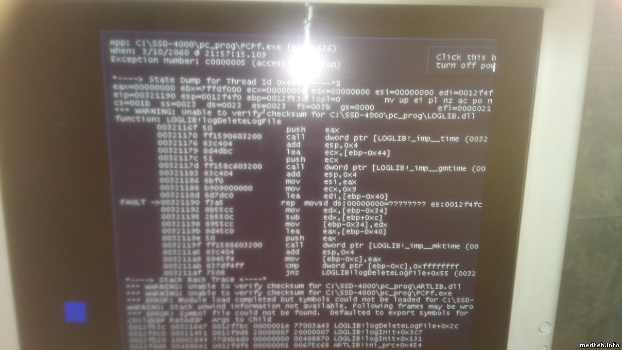 Как я выше писал был чёрный эеран с множеством цифровых последовательностей и надписи на англ " не могу подгрузить модуль программы" чтото вроде и название и путь файлов c:\ssd-4000\pc_prog\loglib.dll и еще два файла artlib.dll и pcpf.exe, как видно все на диске С: Версию софта скажу поже.