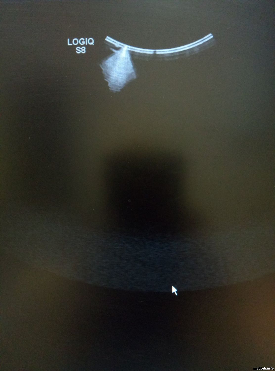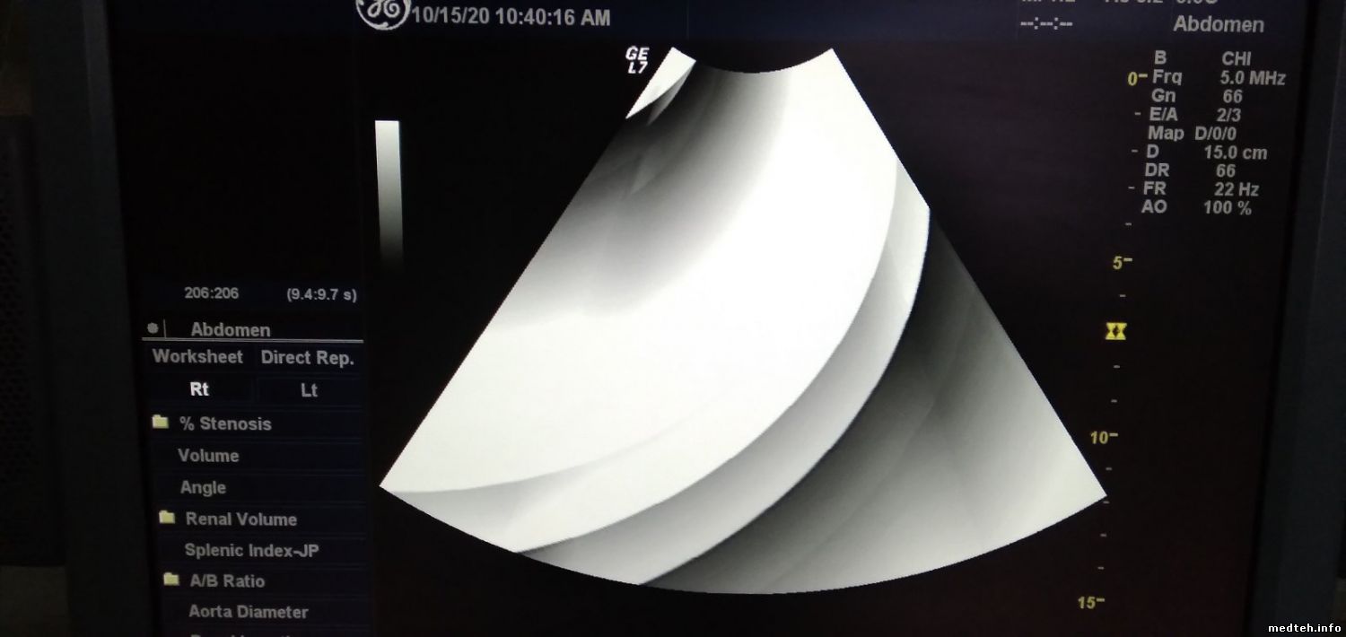 Друзья, добрый день. На LOGIQ 7 линейный датчик M12L даёт очень слабую УЗ картинку (TGC и усиление максимум). При этом на другом аппарате датчик показывает нормально. Менял разъёмы подключения - проблема остается. Другие датчики (вагинальный, конвексный) работают хорошо. И самое интересное, правая сторона УЗ изображения копирует левую. На фото - отвертка приложена в одном месте, слева на экране отображается в двух местах. При перемещении объекта он перемещается и справа и слева. Если что-то подобное у кого-нибудь случалось, поделитесь опытом. Заранее спасибо.