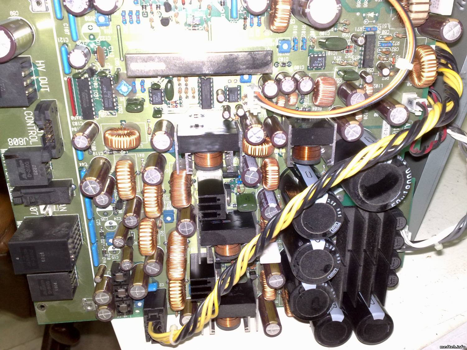 при включении аппарата, проходит все тесты, все кнопочки горят и светятся всеми цветами что им и положено, и слушаются. Разобрав монитор пришел к выводу что нет высокого напряжения и на плате питания грелись резисторы планарные(изменился цвет платы). Может у кого нить есть схема аппарата, или хотя бы монитора.