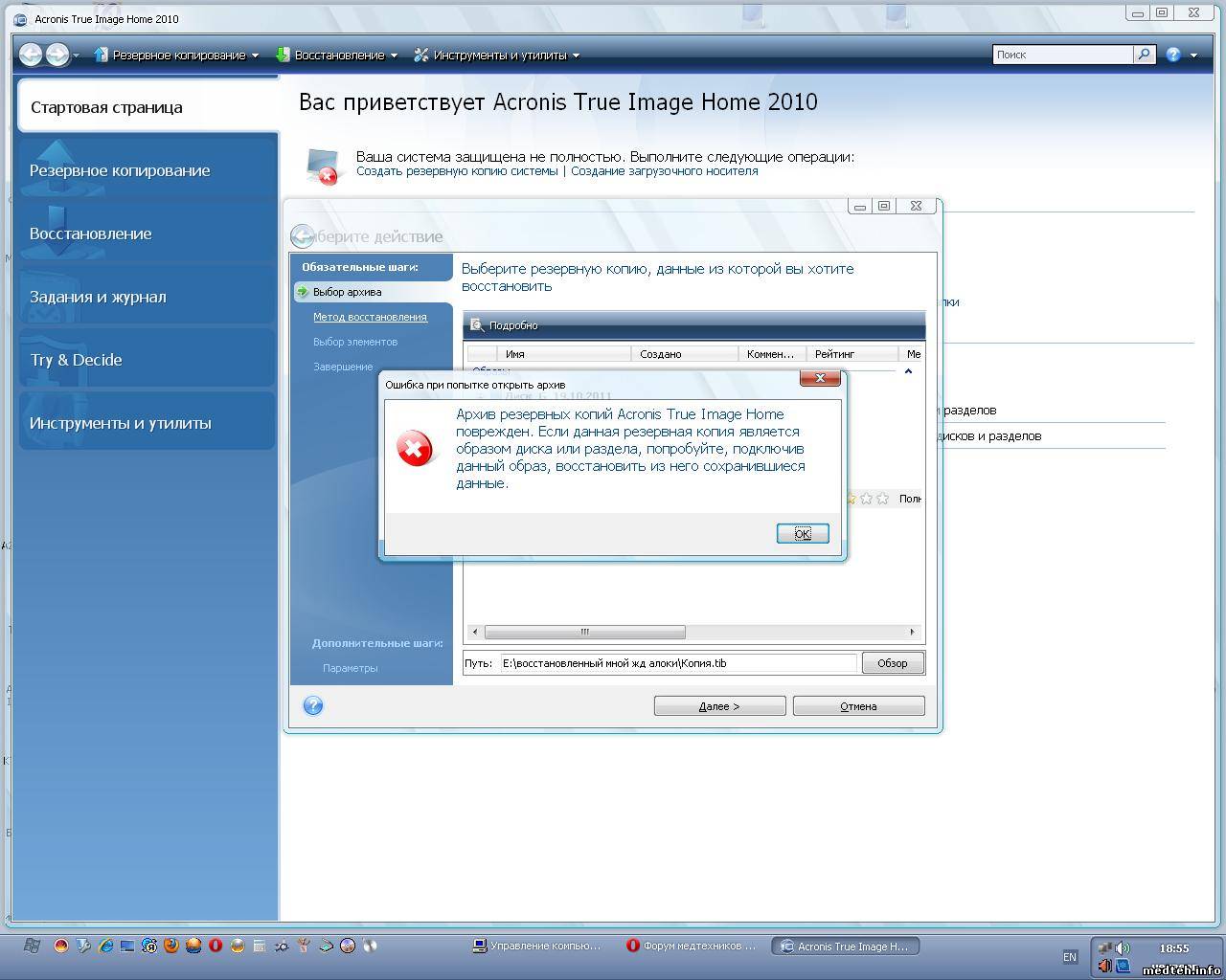 Акронис сборка 6053. MD5: 17888C7000098A8A34508471A61DAF78 Как настройки в биосе могут повлиять, причём другие образы с расширением .tib нормально закатываются. По остальным вопросам ничего не подскажете? В продолжение истории - поставили диск обратно в комп, второй раздел в "моём копьютере" не имеет названия и ёмкости, при обращении к нему пишет что то типа файл или папка повреждена, нет доступа, при повторном чек диске пишет "Не удаётся записать во второй загрузочный сектор", сканирование диска викторией и СМАРТ всё О.К.