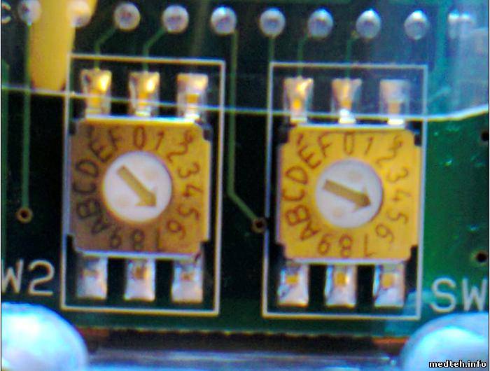 Сравнил сопротивления двух энкодеров, они отличаются и не совпадают. Согласно фото SW2-его стрелка стоит в положении 6, а SW1 в положении 5. Подкрутил SW1 в положение 6 и сопротивления стали одинаковыми на обоих энкодерах. Так же оба энкодера установил в положение 5 и так же энкодеры показывают одинаковые соротивления, из этого следует, что энкодеры рабочие. Сопротивление контактов около 00,1 Ома.