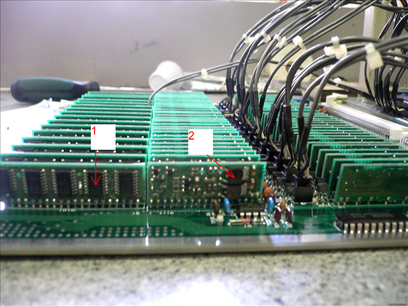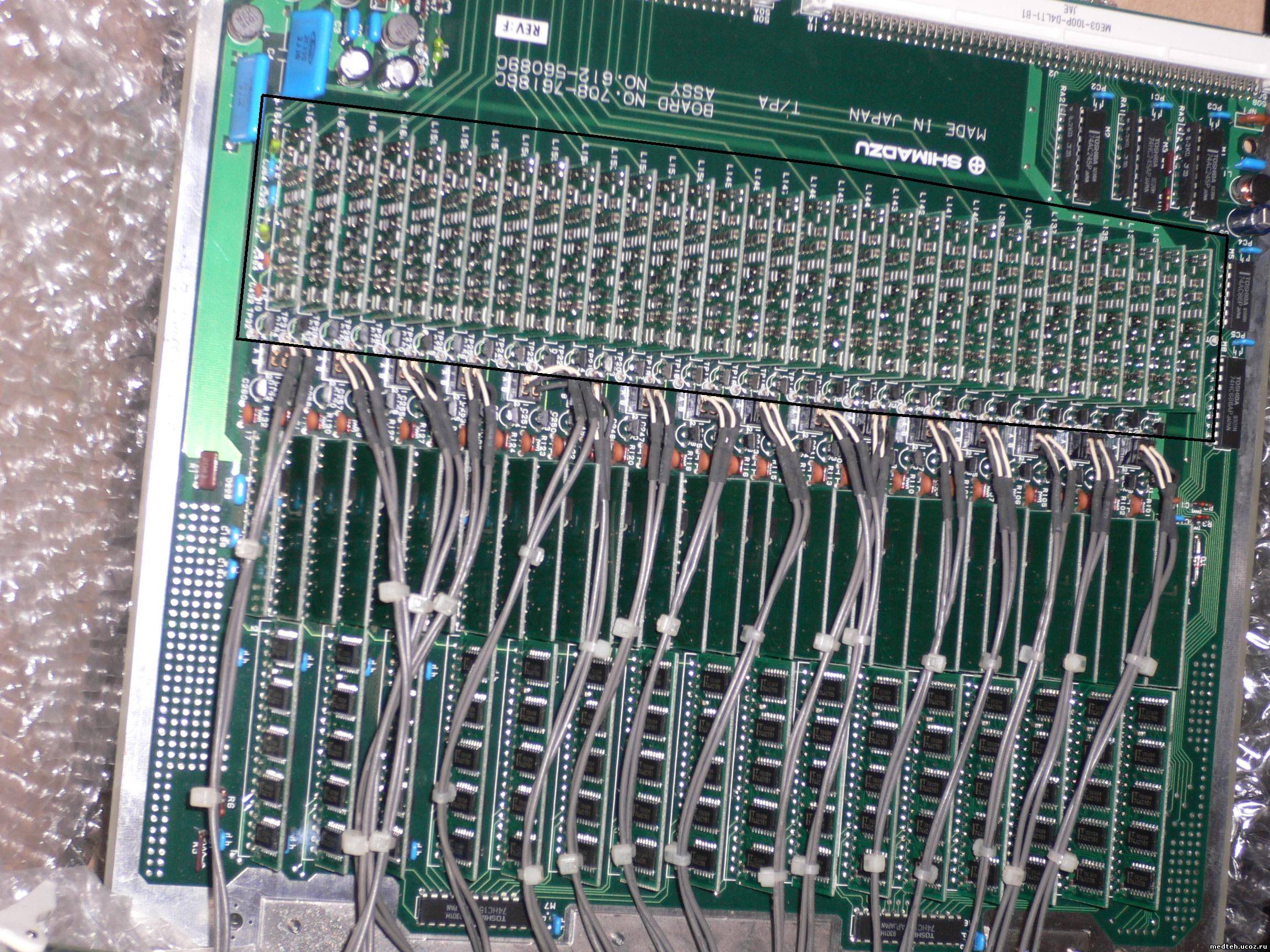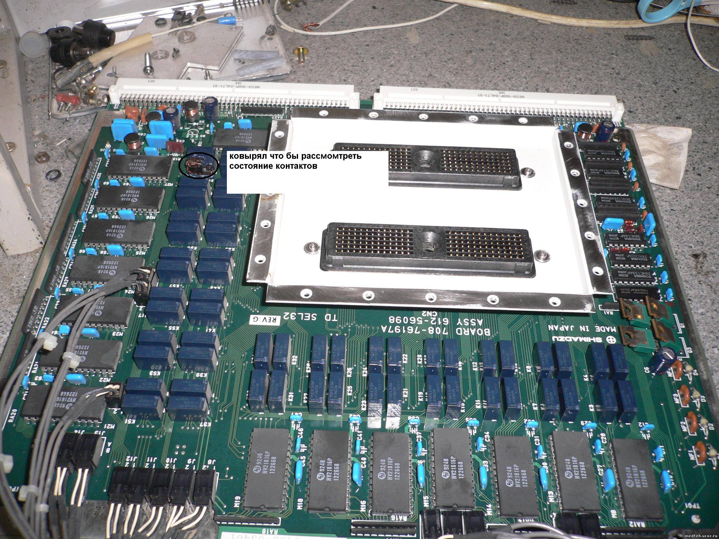 генерация, прием, выход уз осуществляют эти две платы. как я понял правая плата переключает с помощью 32 реле линию на конвекс, а с помощью вв коммутаторов излучение идет на кристаллы. проводники, что соединяют платы с левой стороны упираются в маломощные транзисторы, которые управляются планками, находящимися слева и справа от разъёмов. провода справа упираются в вв ключи.