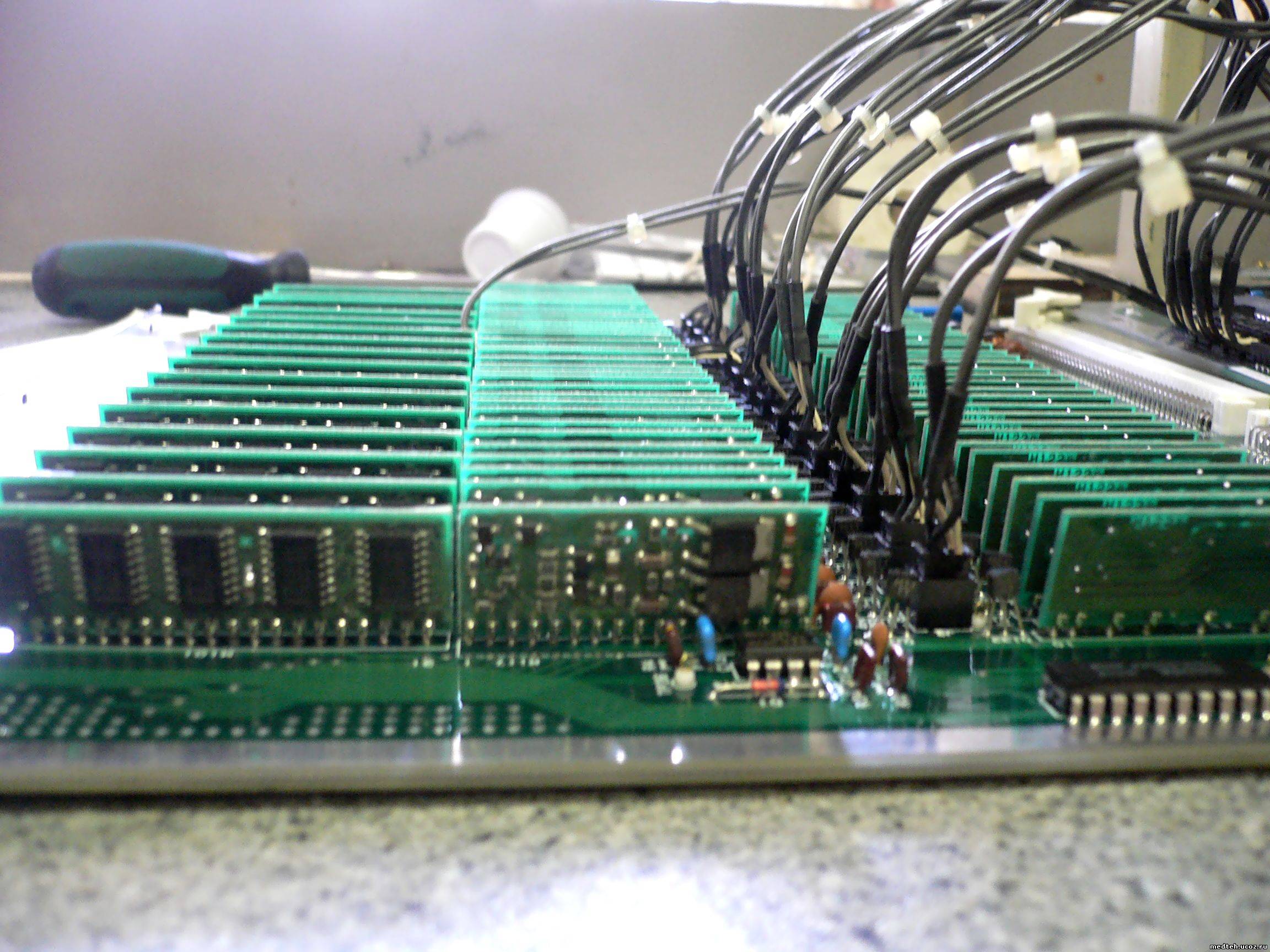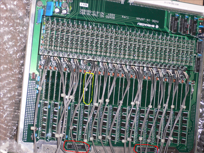 эта плата соединяется с платой ввода-вывода ультразвука (на ней стоят высоковольтные ключи 16 шт и 5 вольтовые реле 32шт) планки которые я выделил при работе греются. не смог понять это нормально или так не должно быть. планки ниже это видимо память куда записывается эхо. они не греются.