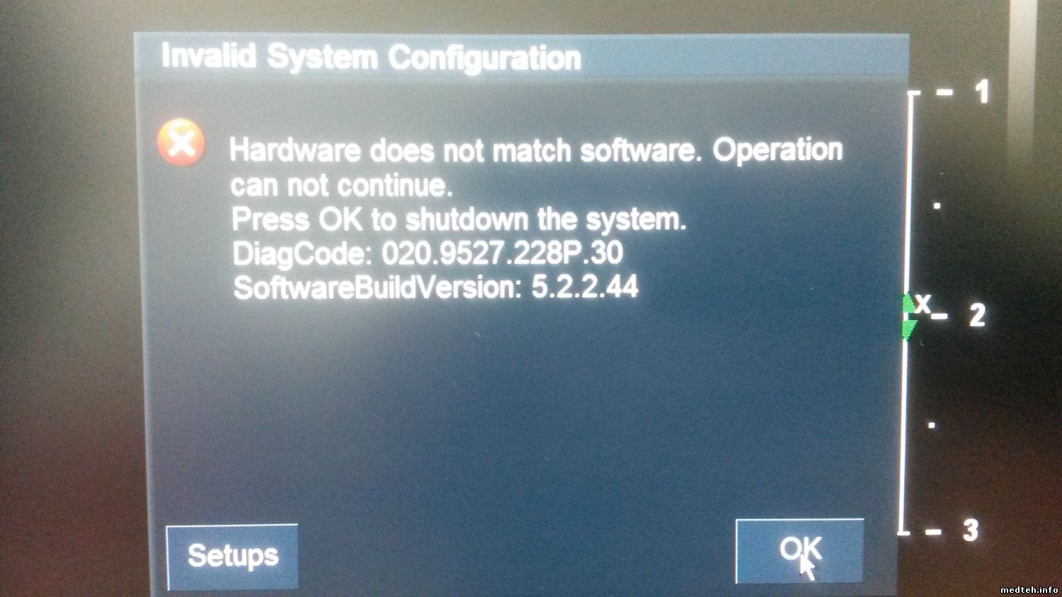 На данном аппарате сгорела видеокарта (одна из двух) поставили другую на таком же чипе. Драйвера стали, но возникает окно с ошибкой.(на картинке) Может кто знает, как побороть это окно?? (до появления окна 2-3 сек видно, что сигнал с датчиков есть, изображения окон нормальные)