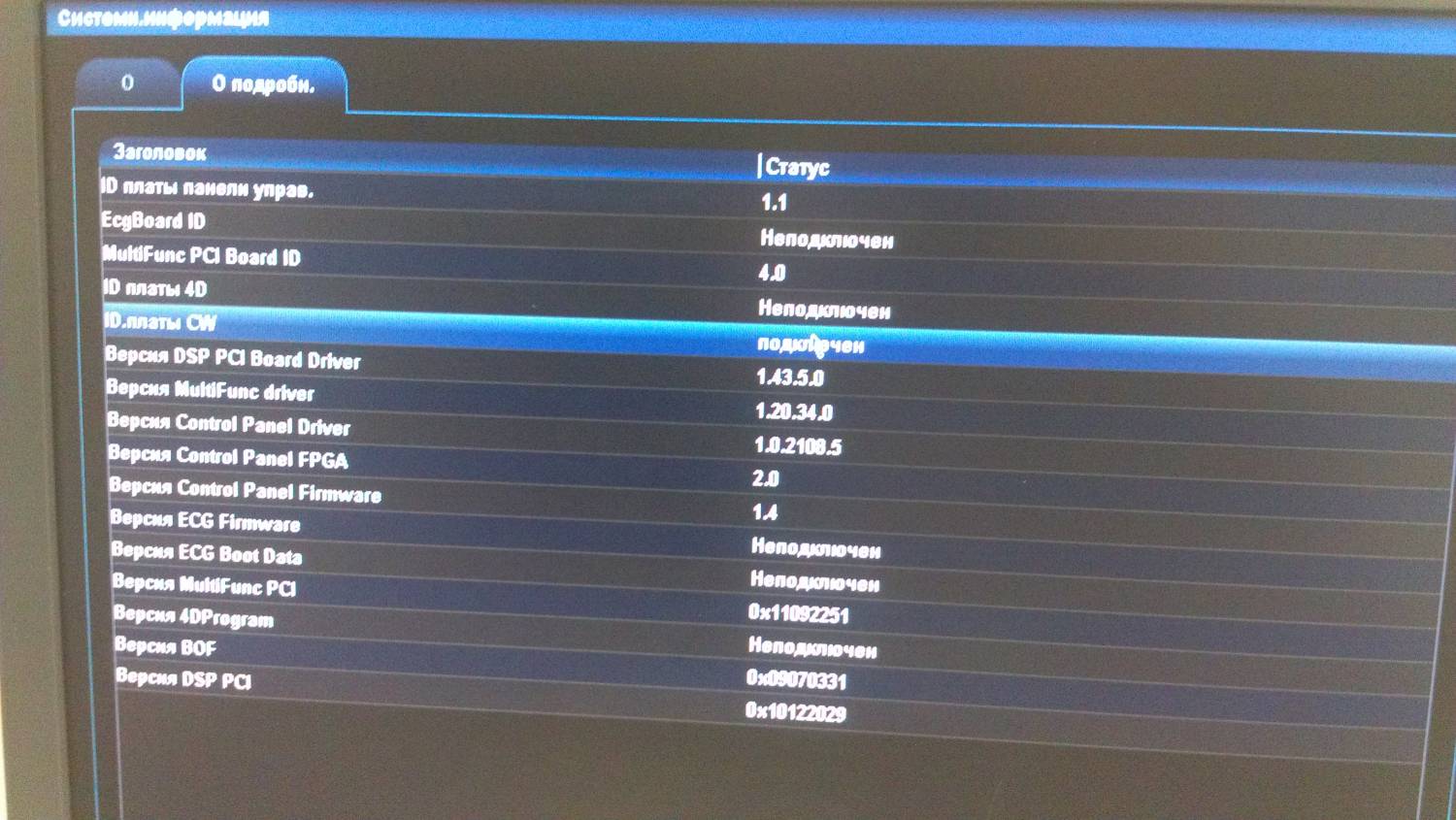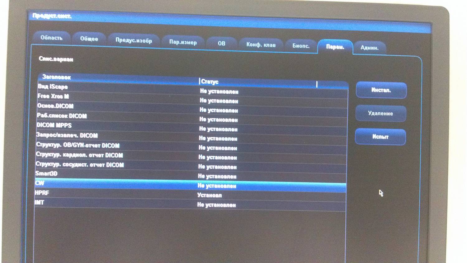 Здравствуйте! Опишу вкратце свою ситуацию. Имеется аппарат Mindray DC-3, врач утверждает что на нем не включается режим cw. Аппарат уже не на гарантии, и из помощи мне было лишь дано руководство пользователя. Я впервые сталкиваюсь с обслуживанием медицинской техники в принципе (хороший знакомый попросил посмотреть, ведь "ты же компьютерщик"), и естественно мало разбираюсь во всех тонкостях этого дела )) Посмотрев мануалы я понял, что вроде как этот режим умеет работать только с датчиком p2p. При работе любого датчика, в том числе и p2p, нажатие на кнопку cw не дает никакого эффекта, хотя соседние кнопки ведут себя адекватно (pw, color, b и т.д.). В настройках графического отображения в режиме датчика р2р я не нашел вкладки по настройке режима cw, хотя для остальных режимов есть вкладки с индивидуальными настройками. Вот собственно и весь сюжет. Буду очень признателен, если подскажете мне следующие вопросы: как выяснить реальную работоспособность этого режима, есть ли он вообще в аппарате (потому что я как понял это опция), может он включается только совместно например с дуплексным делением экрана, или только совместно с определенным режимом. В общем буду рад любой помощи. Спасибо!