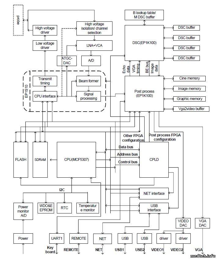 Вот выдержка из мануала "The start-up process is described as follows: 1. The system finishes the initialization of CPU, DRAM and chip selection. 2. The system copies the firmware in the flash to DRAM. 3. The system runs the software in DRAM, configures CPU interrupt, and fills in the interrupt vector table. 4. The system configures the display circuit FPGA. 5. The start-up image displays. 6. The system configures other circuit FPGA. 7. The system reads out the preset data, and based on the preset, selects the exam mode and the transducer. 8. The front end is initialized based on the selected transducer. 9. The system initializes the scanning and back-end parameters, opens the scanning interrupt and performs the image scanning. 10. The system enters the start-up image." Так что мои подозрения не на материнскую плату, а на периферию - клавиатуру и плату трансдюсеров.