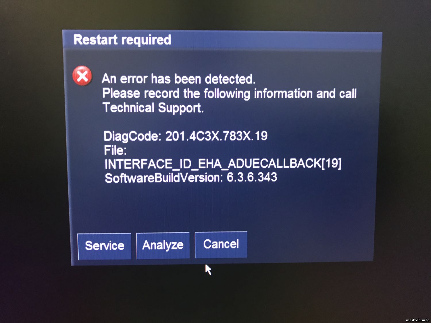 Аппарат Philips iU22 в конце загрузки операционки, после щелчка (подключения датчиков) ... Выдаёт вот такую ошибку (на фото). После нажатия кнопки анализ ... ничего не происходит((( Система просто зависает наглухо!