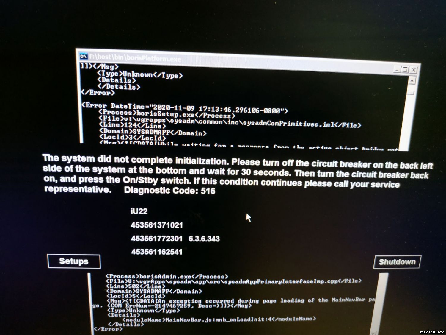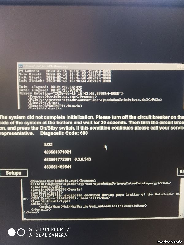 Аппарат Philips iU22 в конце загрузки операционки, после щелчка (подключения датчиков) ... выдаёт вот такую ошибку (на фото).