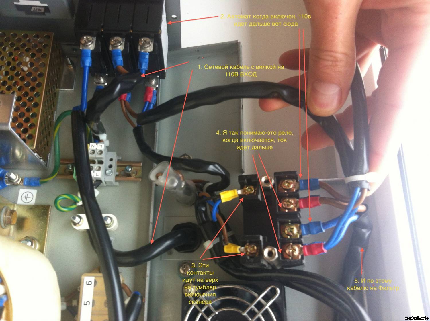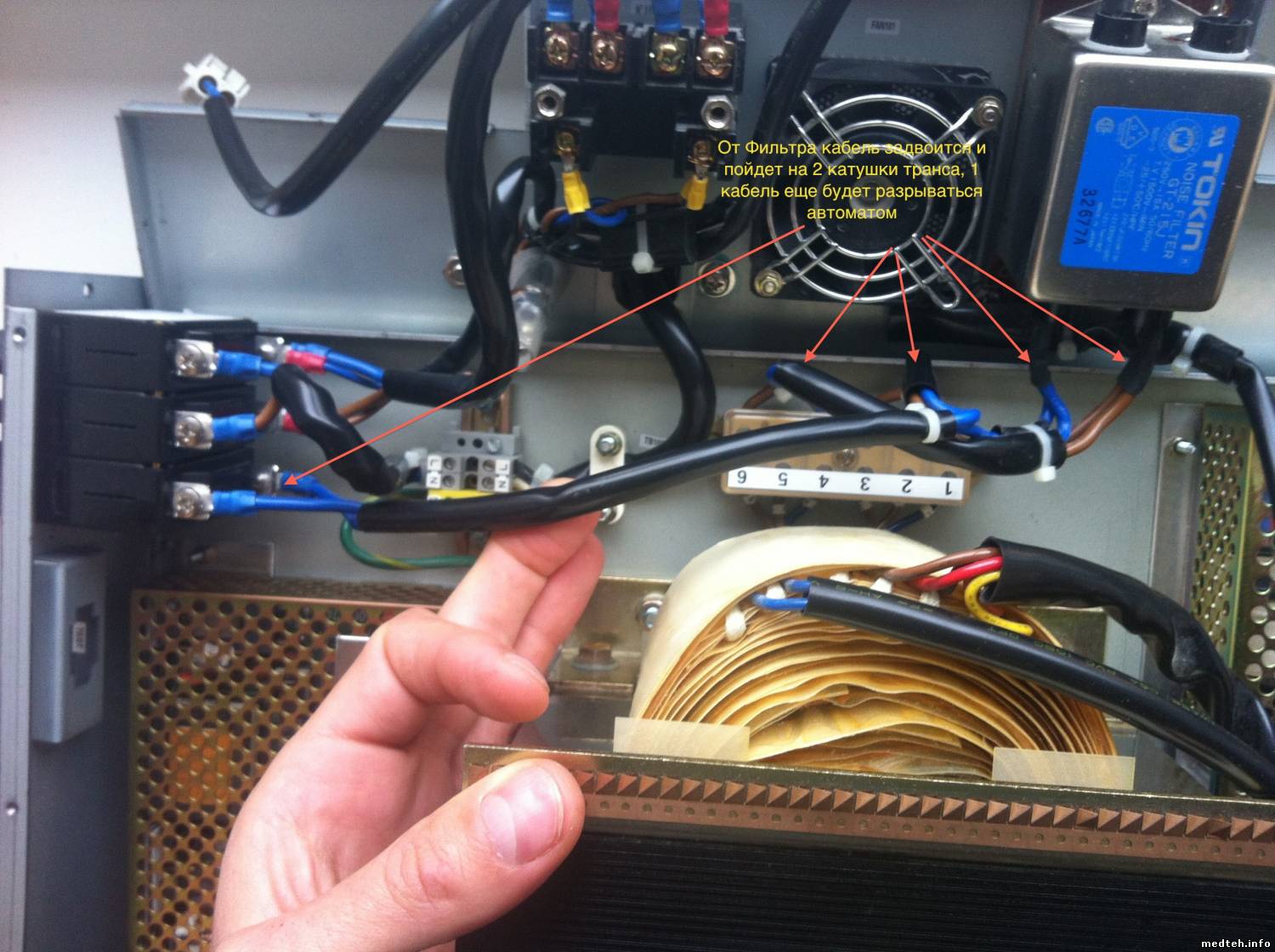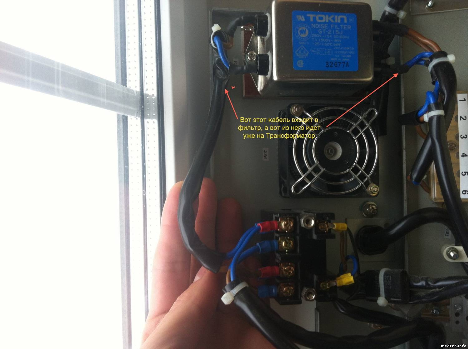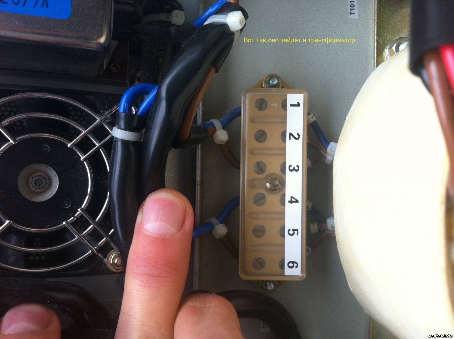 Покажите весь путь проводов от сетевой вилки до трансформатора, стрелочками или кружочками на нужных фотографиях, с комментариями, например так: - вот сетевой кабель (провода таких-то цветов) подходит к какой-то там колодке или коробочке, - вот от этой коробочки такие-то провода идут к еще какой-то штучке, - - - вот от этой штуковины такие-то провода заходят в трансформатор.