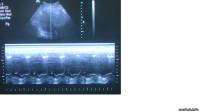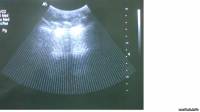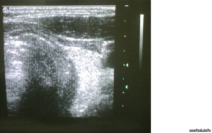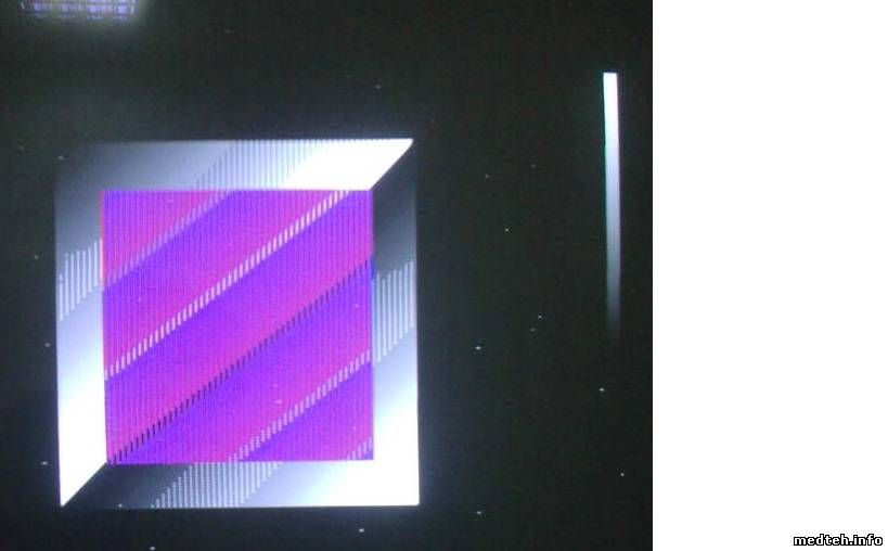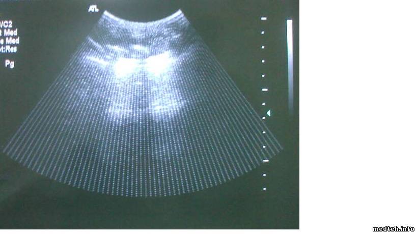 Достался мне после безуспешного ремонта: вышел из строя основной источник +5В, туда-сюда этот танк возили, вернули, питание я сделал, но проявилась новая неисправность - временами ультразвуковое изображение становится "полосатым" и теряет оттенки серого, иногда эти регулярные полосы (я их насчитал 64) становятся особенно выраженными (см. картинки).