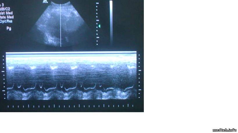 В режиме B+M при этом М-эхограмма выглядит нормально, со всеми градациями серого, а В-изображение - плохо.