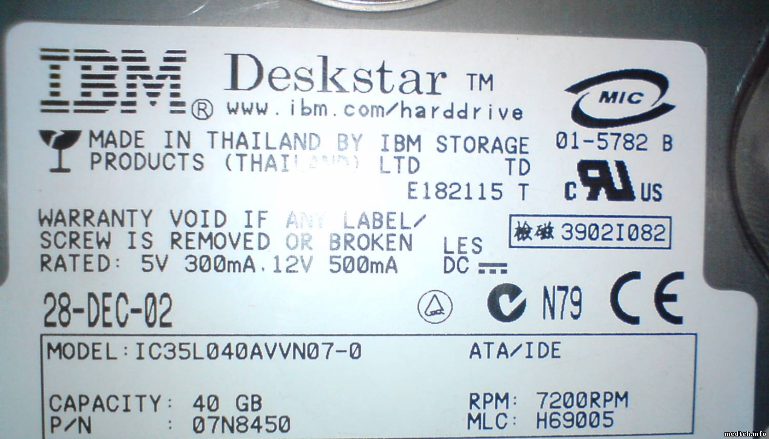 Винт IBM 40 гиг интерфейс IDE Год выпуска аппарата точно не могу сказать но где то 2000 или позже потому что нем стоит WIn 2000 (судя по лицензионной наклейки на корпусе). Результатов никких винт не опознается не одним компьютером куда я его пытался подпихнуть.