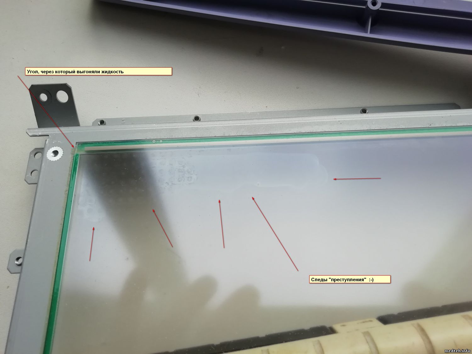 Уважаемые коллеги. Горящая проблема! У нас в одном мед. учреждении в ожидании санпроверки глупые тети помыли чем-то сенсорные панели в двух одинаковых аппаратах. В результате обе панели отказали (не реагируют на нажатие). При внешнем осмотре видны темные пятна в нижней правой части монитора.