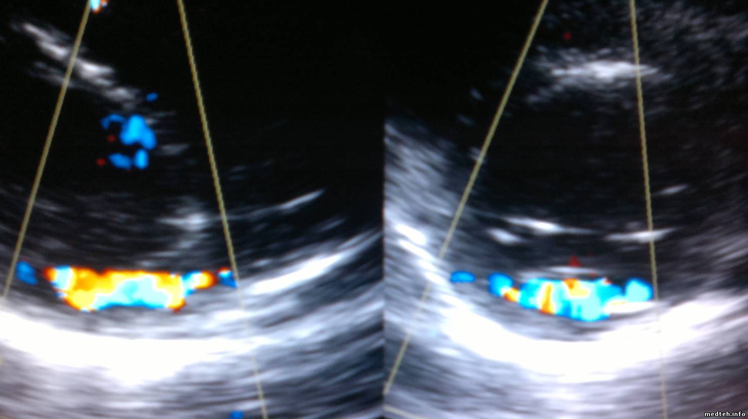Столкнулся с навязчивым цветовым шлейфом, изображенным на картинке. Место расположения на скане сердца - стабильное - как показано на фото. Пробная замена датчика эффекта не дала.