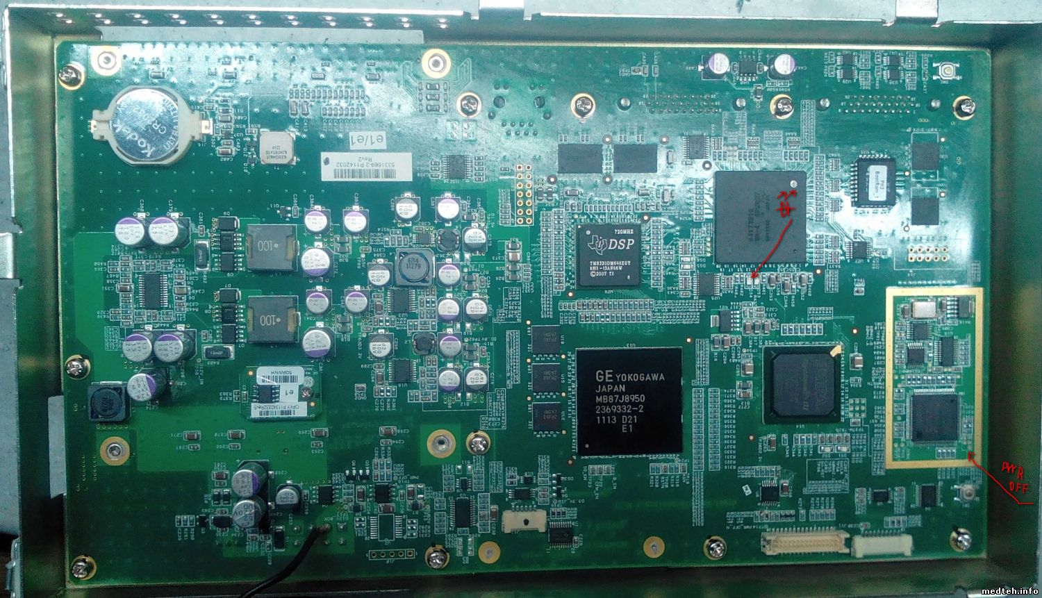 После нажатия на пуск через несколько секунд отключается. Снял РС модуль, БП, "косу" и подключил на столе. При нажатии PC-ON через несколько сек приходит сигнал PWR_OFF. Если с модуля РС снять COM (Computer on Modules), сигнал PWR_OFF не приходит и БП не отключается. Сигнал PWR_OFF приходит с участка схемы, обведенной желтым. Подозреваю, что это watch dog. Два светодиода на фото зажигаются при включении на 1 сек и тухнут, одновременно сигнал Reset в желтом квадрате меняется с 0 на 1. Может у кого нибудь есть полный Service manual или идеи. Подкинуть на другой аппарат пока нет возможности.