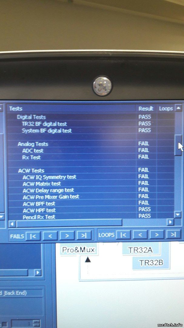 Ребята, помогите советом. На аппарате Vivid i наблюдается темная полоса (на фото), полоса эта видна при подключении конвексного и линейного датчиков. На секторном таких артефактов не наблюдается. Сервисные тесты не все прошел (результат на фото).