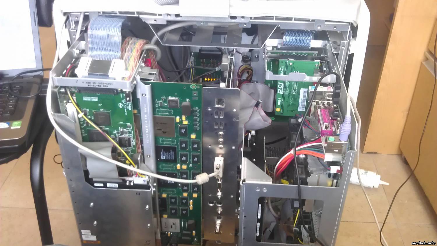 Есть же выход с видео карты, с этого выхода идет кабель в плату обработки изображения (обычно PCI) и с этой платы уже непосредственно на монитор и остальные устройства (видеопринтер, сенсорная панель и прочее). И так, как бы я поступил: 1. к видео выходу самого системного блока (В-SUB, DVI) подключил обычный монитор и включил, и если картинка не появилась бы, то копал бы дальше в сторону системника (чистка всех контактов всех плат, поочередное отключение компонентов и так далее) 2 продул компрессором внутренности аппарата; 3 достал все платы с разъемов (PCI, PCIE) по-очереди и почистил контакты на платах и все собрал, попробовал бы включить; 4 опять к видео выходу самого системного блока (В-SUB, DVI) подключил обычный монитор и включил и если картинка появилась, то проверка платы обработки изображения (подключение обычного монитора ко всем выходам) и проверка всех кабелей от этой платы и монитора. Пункт 4 свидетельствует о неисправности монитора самого узи или отошедших кабелях от монитора.