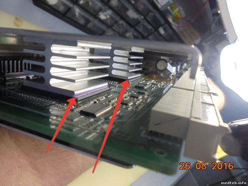 похоже на диверсию: к плате большие микросхемы припаяны BGA и прижаты радиаторами. У двух из четырёх между радиатором и микросхемой теплопроводная прокладка. Ясен пень, что без этой прокладки со временем они "отклеются" от платы.