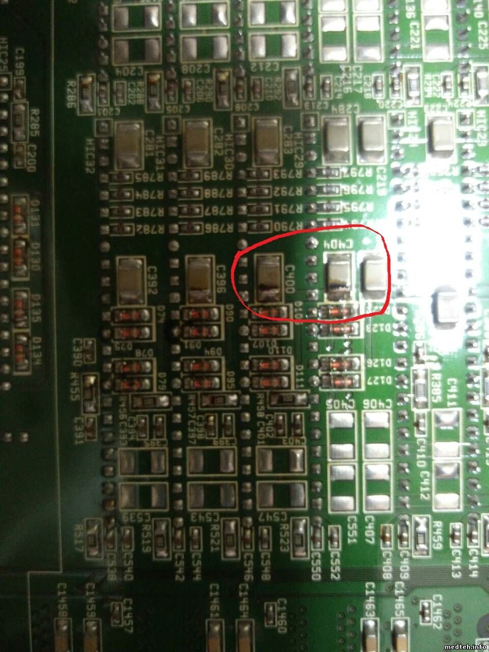 Ничего не помогло из вышеперечисленного. Через несколько дней аппарат запустился и после 30 сек работы со "снегом", стал работать нормально. Хватило его на пол дня, затем картина повторилась. Проблема носит явно температурный характер. Подсказали, обратить внимание на плату бимформеров. На одной обнаружены следы перегрева и странности на конденсаторах( на фото). Проверил напряжение осцилографом- ровно, заодно проверил все напряжения на всех конденсаторах- без прыжков.