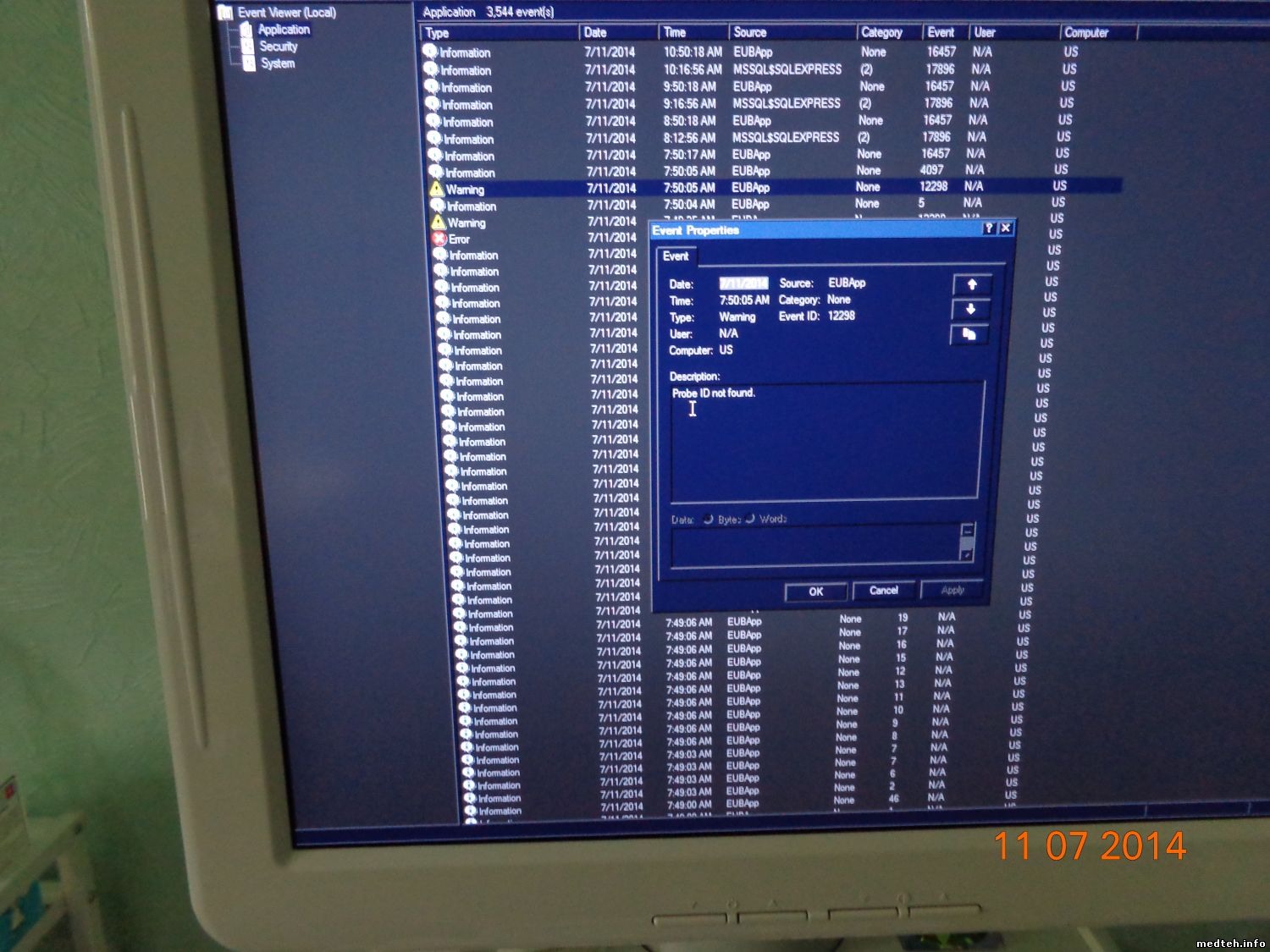 ...опять тот-же дефект, приезжаю уже всё нормально. Посмотрел лог приложения, вижу предупреждение и ошибку, по времени вроде совпадает с артефактом на мониторе со слов врача. И как её интерпретировать?