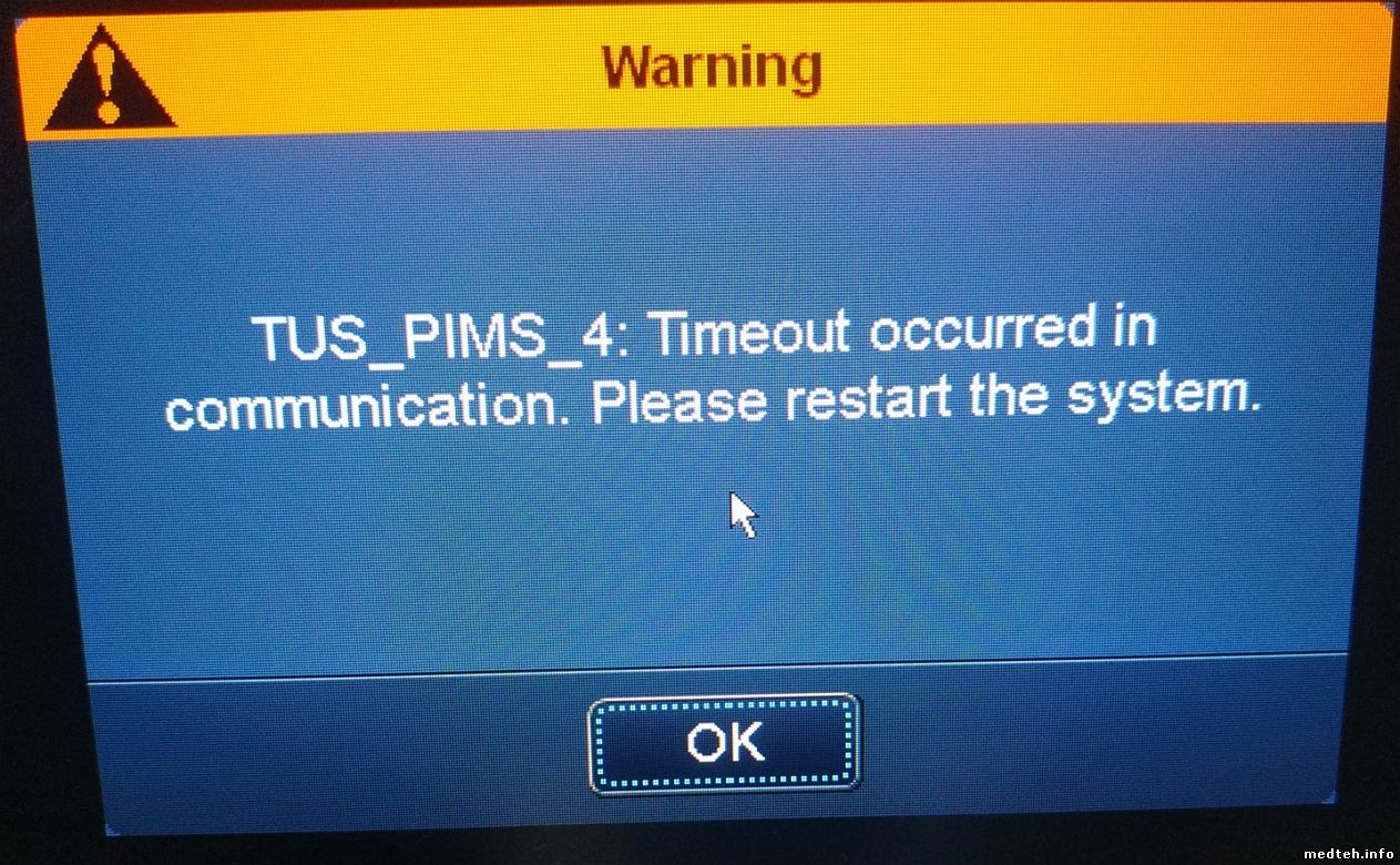 Не проходит процедура регистрации пациента. После ввода данных, при попытке начать исследование появляется ошибка: "TUS_PIMS_4: Timeout occurred in communication. Please restart the system."