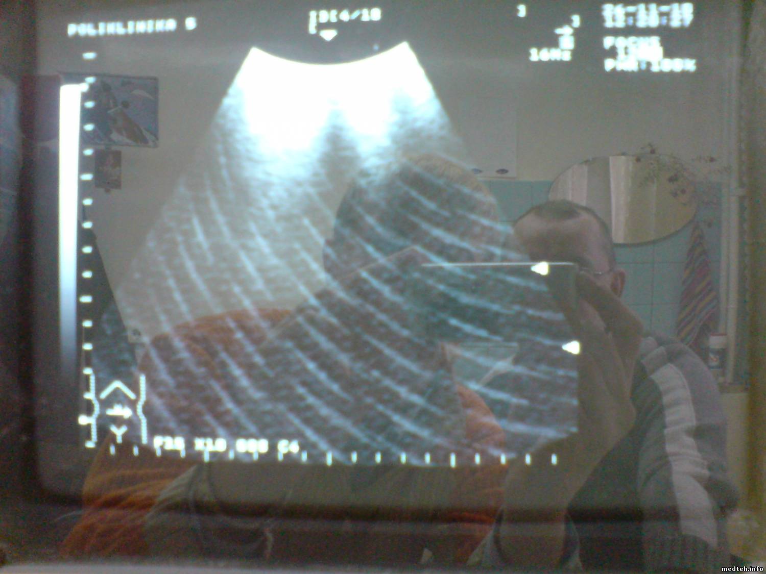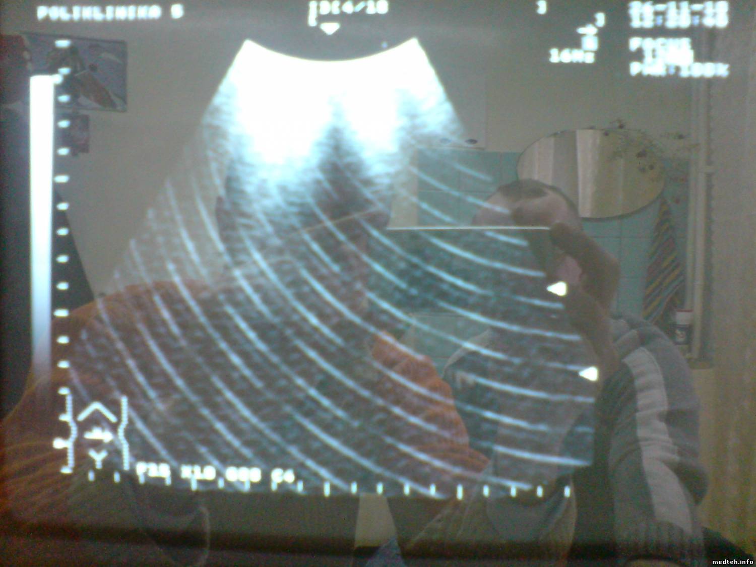 Помехи в виде дугообразных линий, движущихся слева -направо, сверху-вниз. Если датчик свободен -помех нет, при прикасании к датчику отверткой с изолированной ручкой помехи еле видны. при касании рукой - помехи как на фото, т.е. человек пациент является "антенной". Аппарат в отделении функциональной диагностики поликлиники, поблизости никаких мощных излучателей электромагнитных волн нет. в этом же отделении, через два кабинета стоит УЗИ Siemens SONOLINE, там все в порядке