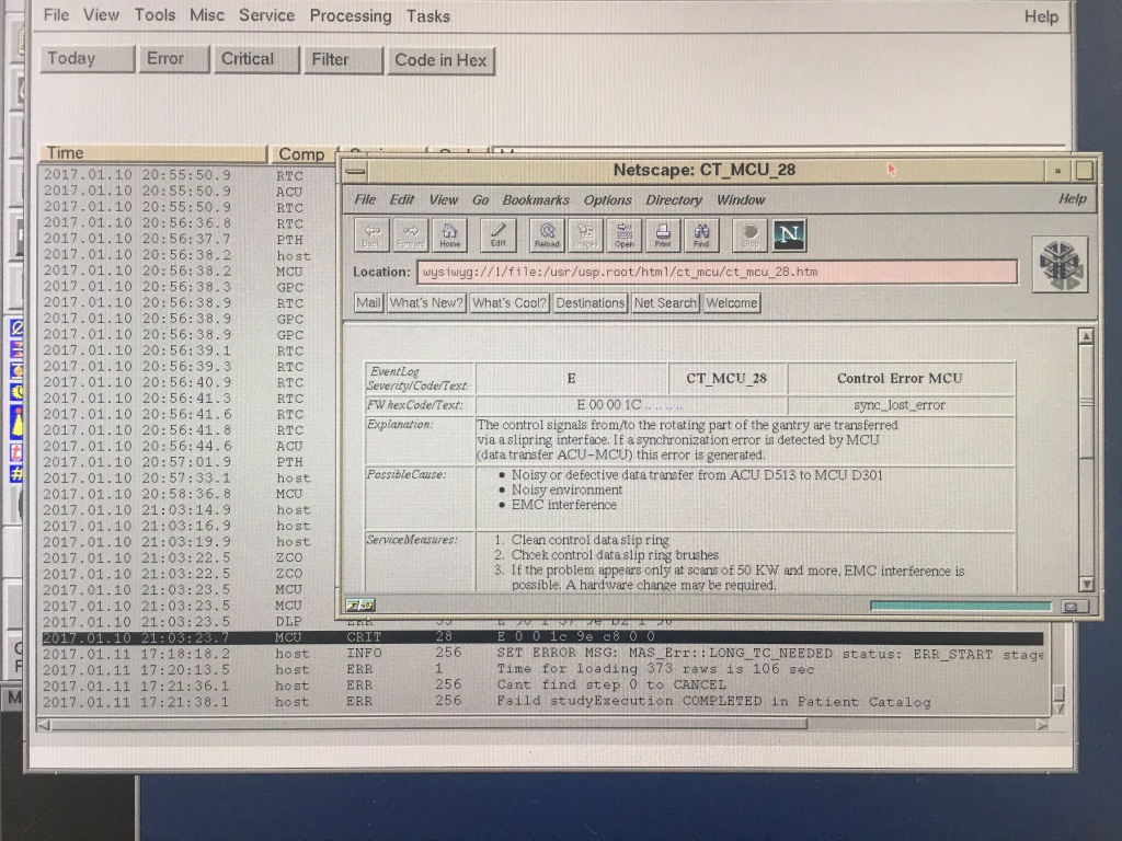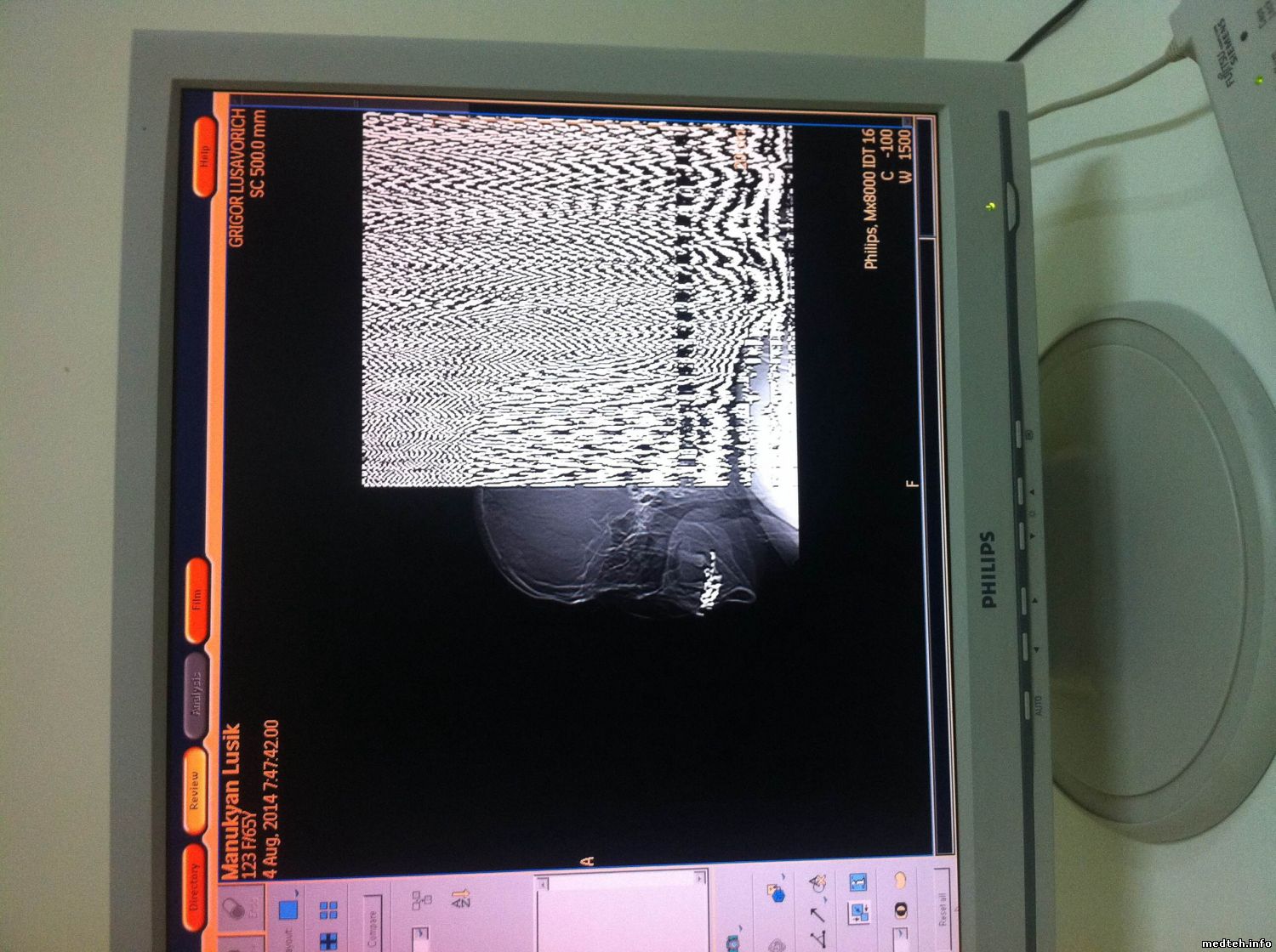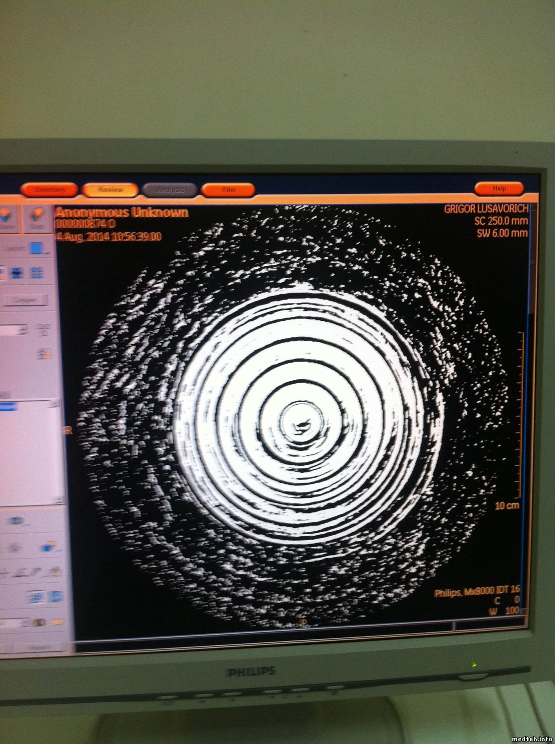работаю с КТ Philips MX8000, вчера столкнулся с такой проблемой: После стандартной процедуре по включению аппарата на томограмме появились шумы в пол монитора, и круговые помехи на сканограме, после чего сделал калибровку по воздуху( раньше помогало ) но в этот раз не помогло а наоборот стало хуже интенсивность шумов на сканограме увеличелось, но на томограмме осталось прежнем.