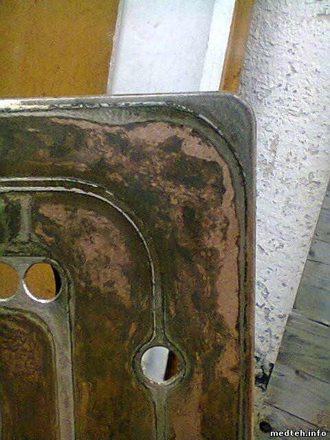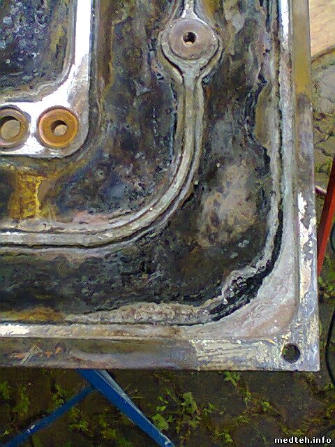 Вот для наглядности фото теплообменника, если внимательно посмотреть то коррозия проникает через весь припой, причем в одном из углов ( начинается с микротрещины из за постоянных изменений температуры), паять сверху просто грех !!!! Мы распаяли полностью, все тщательно зачистили , обработали пастой и запаяли обратно. На мой взгляд самый надежный вариант !