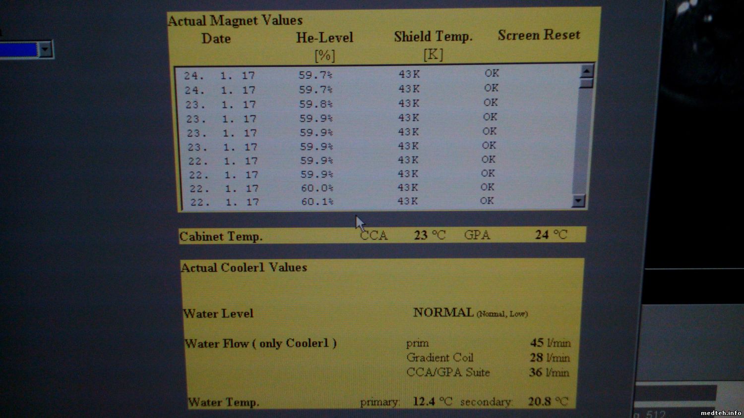 Подскажите неопытному.На МРТ Тошиба стоит компрессор с гелием.Вода охлаждения показывает вход 21гр(должна быть 18гр) выход 26гр.Гелий охлаждает воду или наоборот?Как определить что пора заправлять гелий и менять абсорбер?
