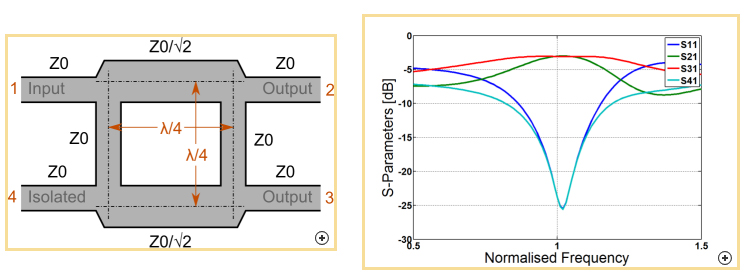 Принцип работы заключается в связности линий, имеющих длину в четверть длины волны. Не буду приводить математическое описание, да и не очень я в нем силен если честно (буду рад если кто разъяснит без сложных формул). Для простоты понимания - вот S-параметры такого ответвителя: