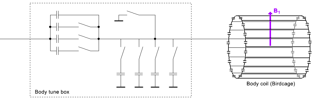 В аппаратах siemens сделано самое простое на мой взгляд решение - там за согласование отвечает блок Body Tune Box (BTB). По сути это массив, состоящий из набора конденсаторов разной емкости, переключаемых в зависимости от нагрузки, помещенной в антенну. Нарисовал примерно по памяти для случая линейно поляризованной катушки (с одним портом):