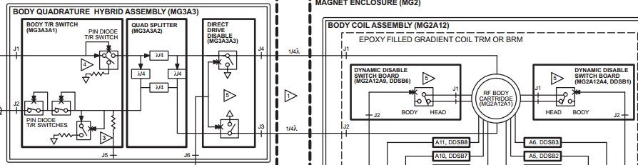 GE используют Quad hybrid splitter (русский аналог, который встречал в литературе - шлейфный ответвитель). Специальная конструкция, позволяющая кроме подавления отраженного сигнала, еще и делать квадратурный режим всего с одного источника (разделяет сигнал на два порта Body coil).